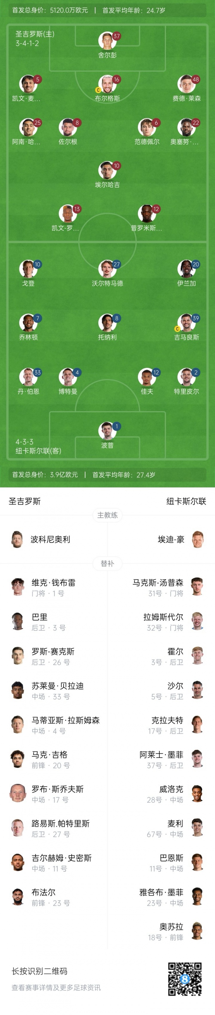紐卡斯?fàn)柭?lián)首發(fā):1-波普、4-博特曼、12-佳夫、33-丹-伯恩、2-特里皮爾、7-喬林頓、8-托納利、39-吉馬良斯、10-戈登、20-伊蘭加、27-沃爾特馬德